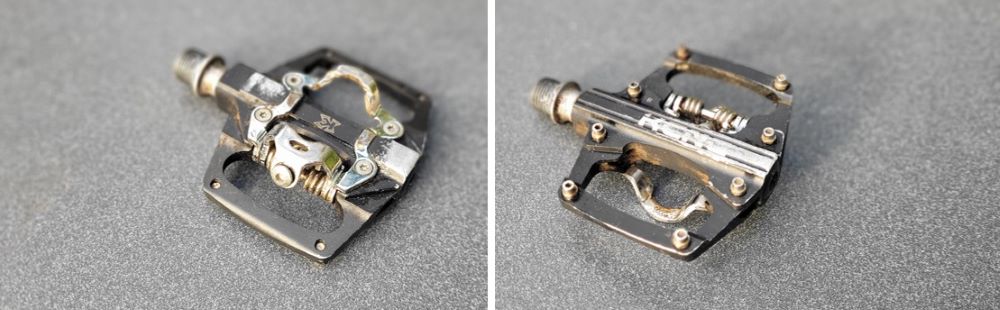 Waar mountainbikers ook hinder van ondervinden is de combinatie met schoenen. Als je los (op de platte zijde) wilt rijden dan mis je altijd een stuk in de schoenzool omdat hier het ijzeren schoenplaatje voor de klikzijde zit. Je kunt je voeten daardoor nooit lekker plaatsen en minder makkelijk verschuiven. Dit staat nog los van het platform zelf dat bij de meeste combi pedalen erg klein is. Omgekeerd, als je ingeklikt wilt rijden heb met de combischoenen te maken met een lage stijfheidsindex (door een soepelere zool) wat ten koste gaan van de krachtoverbrenging (dat juist het voordeel is van ingeklikt rijden). Je zou natuurlijk per rit kunnen kiezen tussen een ander type schoen zodat je steeds maar een kant van je pedaal gebruikt. In dat geval zou ik ook het pedaal even wisselen voor een ‘echt’ klikpedaal of ‘echt’ platform pedaal zodat je twee zijden beschikbaar hebt en met je flats niet steeds op de bobbel van de klik zit of met je harde klikschoenen op de pinnen van de flats..