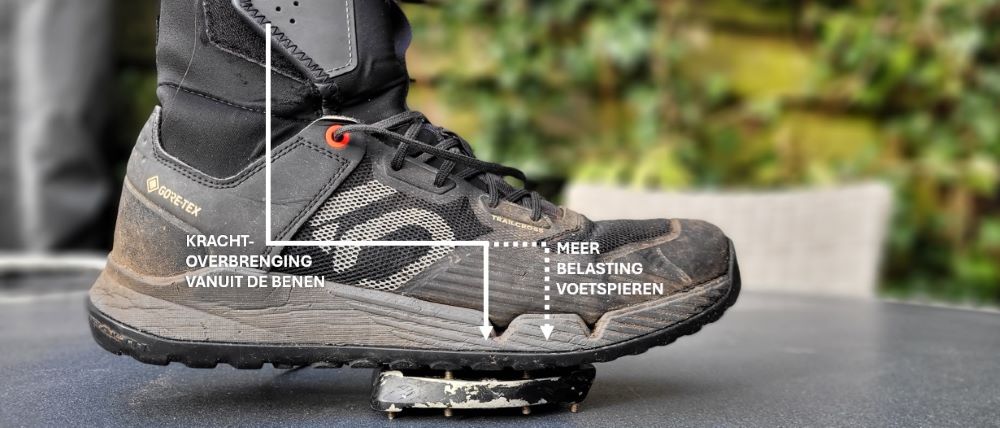 Op platformpedalen zien we veel mensen met de voorvoet (soms zelfs met de tenen) trappen. Meestal aangeleerd vanuit de racefiets of de stadsfiets (kijk maar eens om je heen). Als je dan gaat staan tijdens het mountainbiken (wat we veel doen op de trails), sta je eigenlijk op je tenen op het pedaal. Aan deze voetpositie zitten twee grote nadelen: